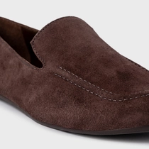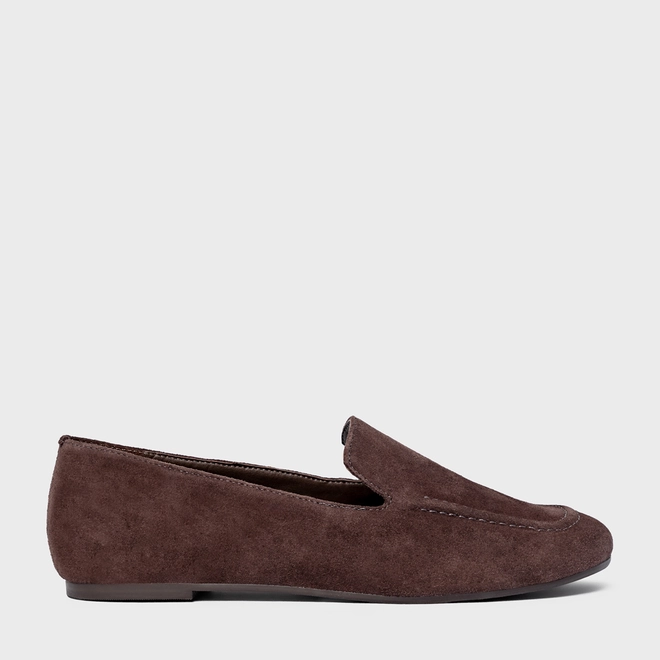 Loafer em couro suede, com salto rasteiro, bico arredondado e recorte lateral na gáspea.