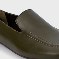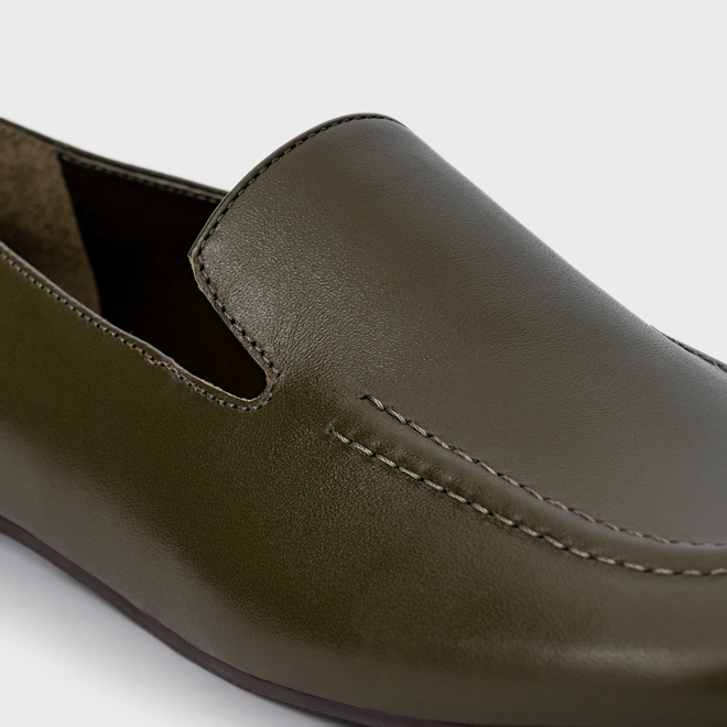 Loafer em couro, com salto rasteiro, bico arredondado e recorte lateral na gáspea.