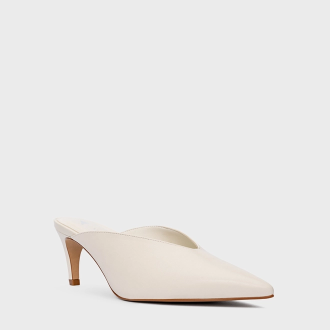 Mule em couro com salto estilo kitten heel e bico fino. Modelo fechado na frente e aberto atrás, possui decote arredondado na gáspea.
