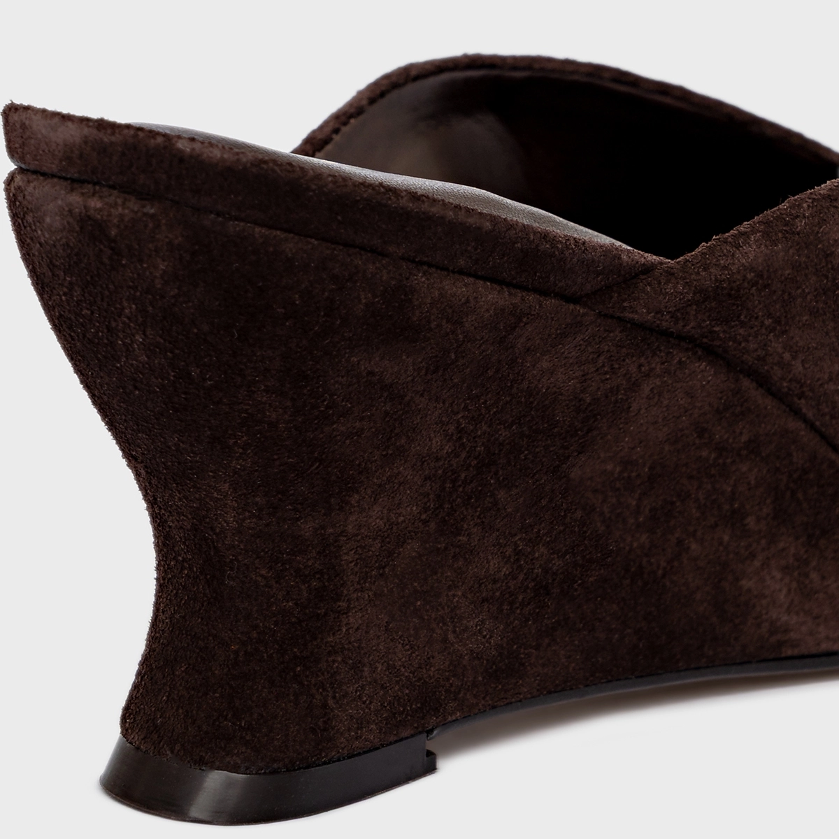 Mule em couro suede, com salto anabela e decote em V. Bico fino, possui cabedal fechado e parte traseira aberta.
