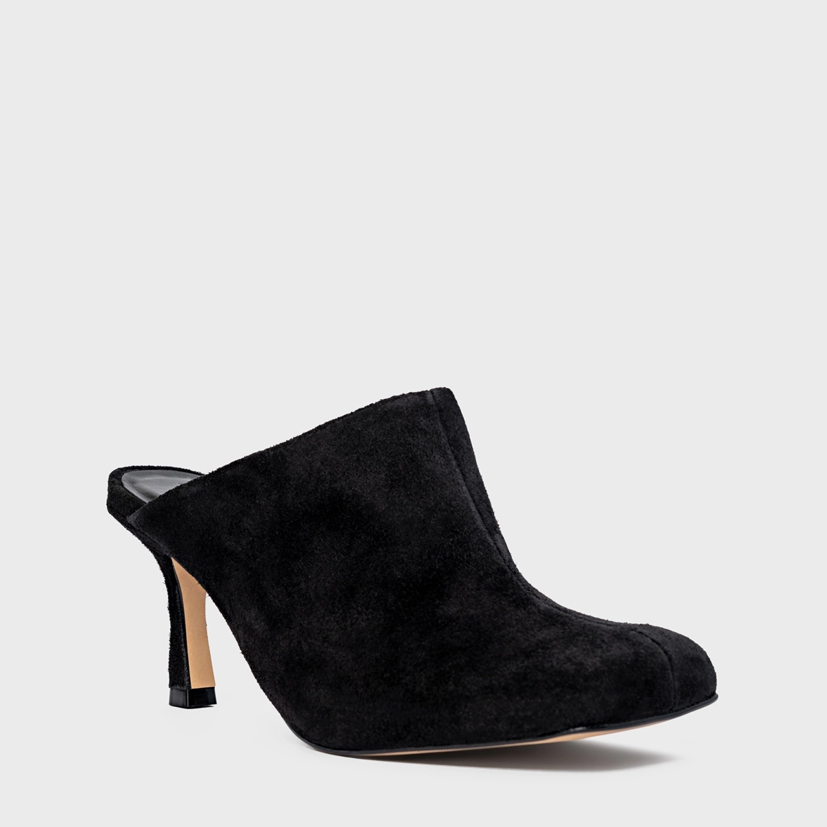 Mule em couro suede, salto fino e bico alongado. Possui o cabedal fechado e parte traseira aberta.