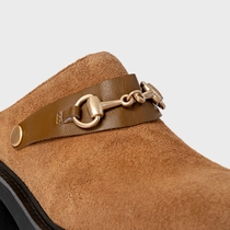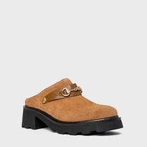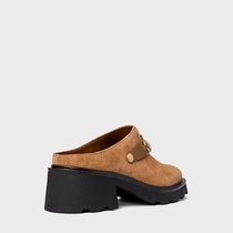 Mule em couro suede, com bico arredondado e solado tratorado. Possui cabedal fechado e detalhe frontal com aplicação em bridão e parte traseira aberta.