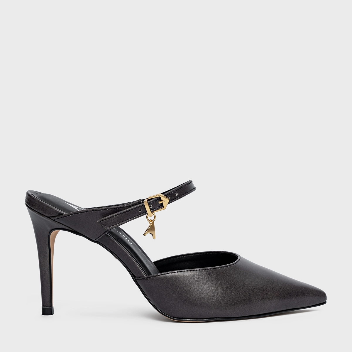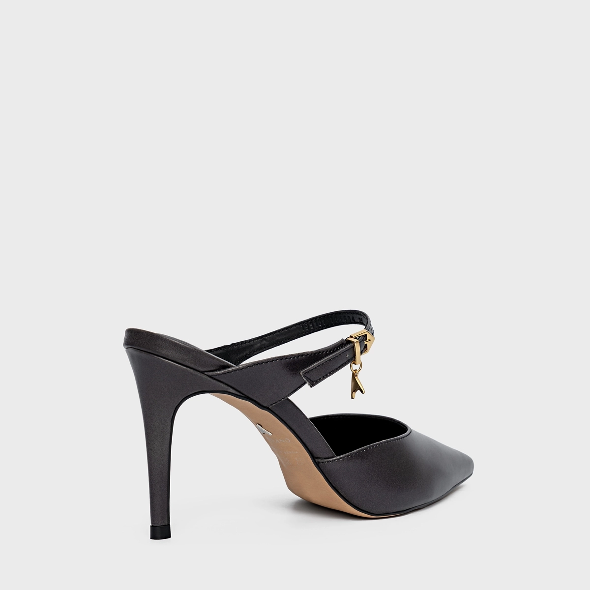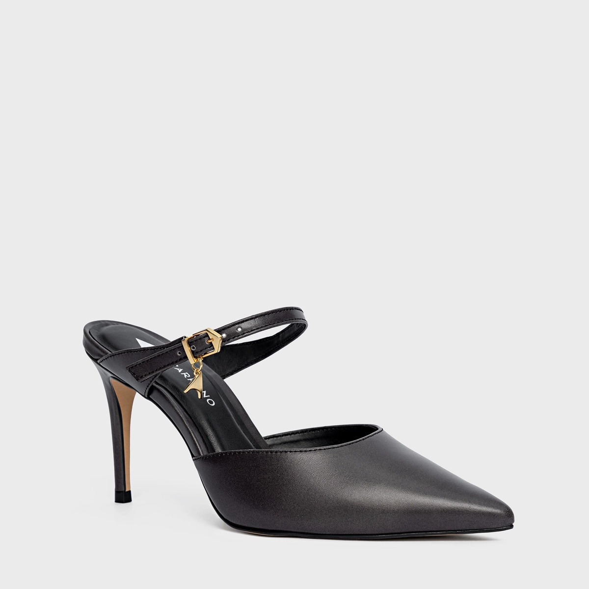 Mule de couro. Bico fino e salto alto, o modelo é fechado na parte frontal e possui uma tira de couro no peito do pé que acompanha o nosso pingente do ícone Carrano.