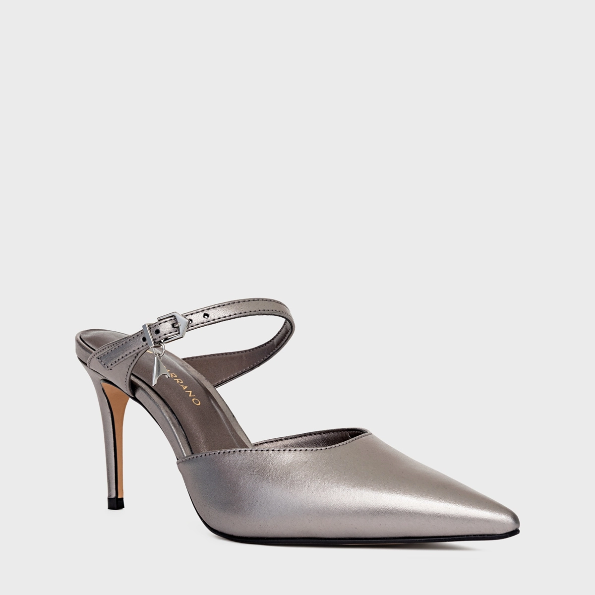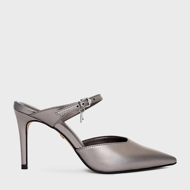 Mule Charm Salto Fino Couro Metalizado Prata Antigo