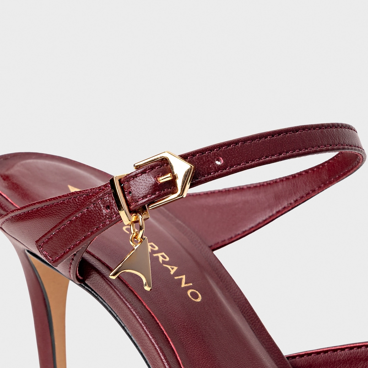 Mule de couro. Bico fino e salto alto, o modelo é fechado na parte frontal e possui uma tira de couro no peito do pé que acompanha o nosso pingente do ícone Carrano.