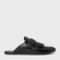 Mule clog em couro, com bico arredondado e solado rasteiro. Possui cabedal fechado com detalhes de franjas e tira com fivela. Parte traseira aberta.