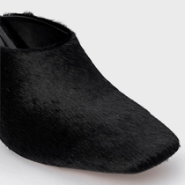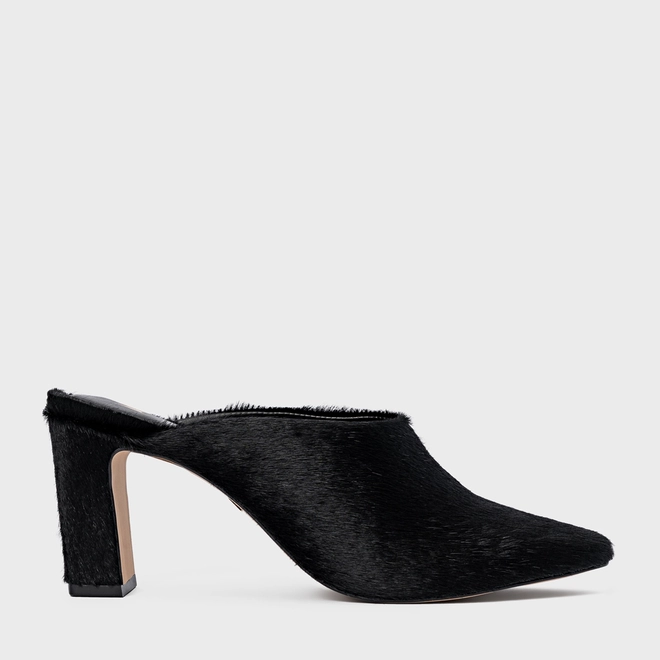 Mule em pelo, salto bloco e bico alongado. Possui o cabedal fechado e parte traseira aberta.