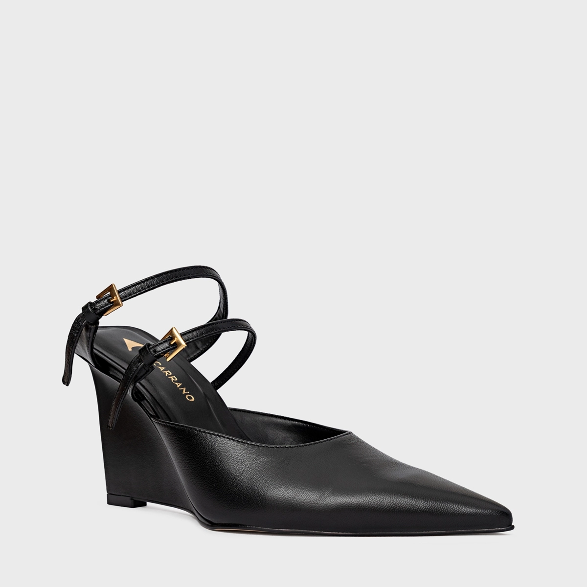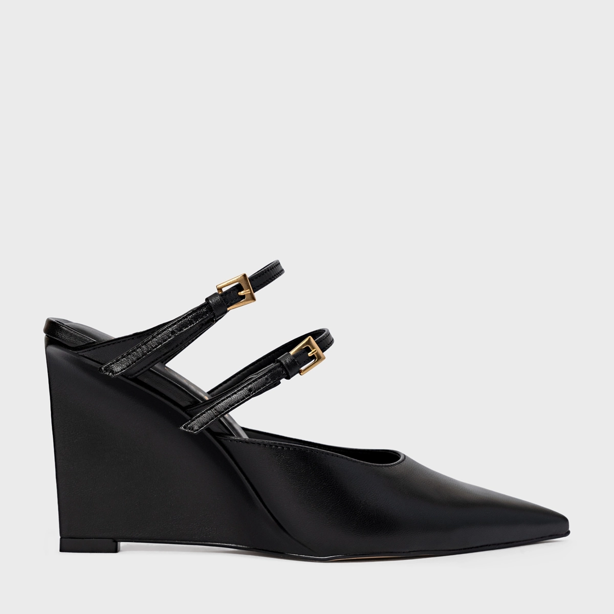 Mule em couro, com bico fino, salto anabela e duas tiras no peito do pé. Possui cabedal fechado e parte traseira aberta.