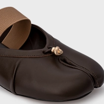 Mule em couro, com design inspirado no clássico Tabi que contém divisórias entre os dedos. Possui adorno na parte frontal que acompanha o modelo e elástico no peito do pé.