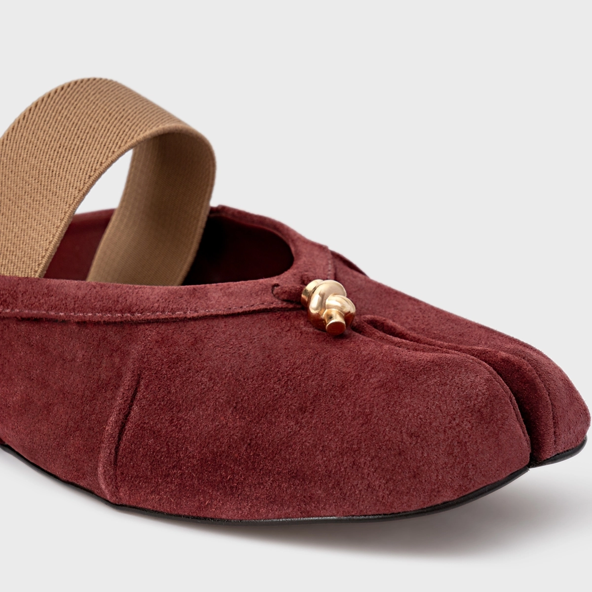 Mule em couro suede, com design inspirado no clássico Tabi que contém divisórias entre os dedos. Possui adorno na parte frontal que acompanha o modelo e elástico no peito do pé.