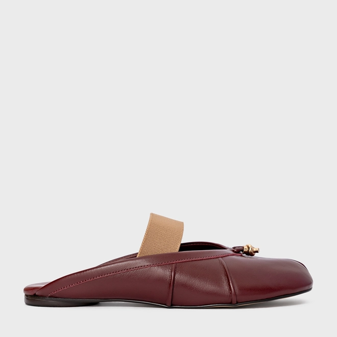 Mule em couro, com design inspirado no clássico Tabi que contém divisórias entre os dedos. Possui adorno na parte frontal que acompanha o modelo e elástico no peito do pé.