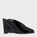 Mule em couro verniz, com bico alongado, salto anabela e decote em V. Possui dedos à mostra e parte traseira aberta.