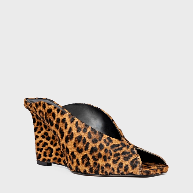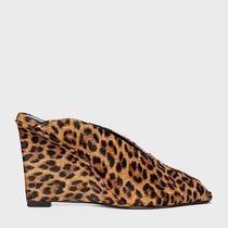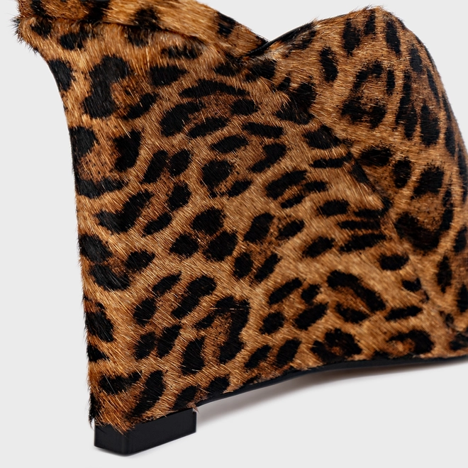 Mule em pelo com estampa animal print, com bico alongado, salto anabela e decote em V. Possui dedos à mostra e parte traseira aberta.