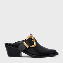 Mule western em couro, salto bloco, bico alongado com ponteira quadrada. Possui detalhe de fivela marcante, cabedal fechado e parte traseira aberta.