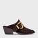 Mule western em couro suede, salto bloco, bico alongado com ponteira quadrada. Possui detalhe de fivela marcante, cabedal fechado e parte traseira aberta.