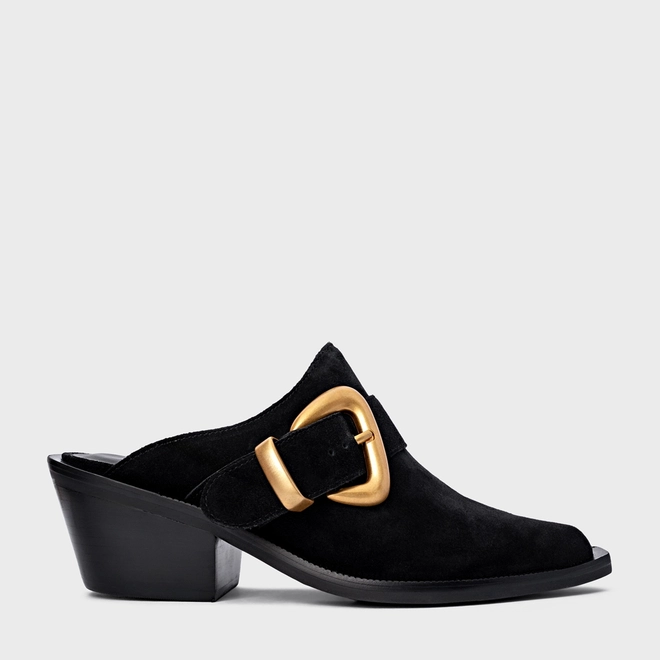 Mule Western Buckle Salto Bloco Couro Suede Preto