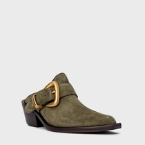 Mule Western Buckle Salto Bloco Couro Suede Verde Army Green