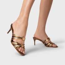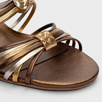 Open Mule Coin Strips Salto Fino Couro Metalizado Bronze