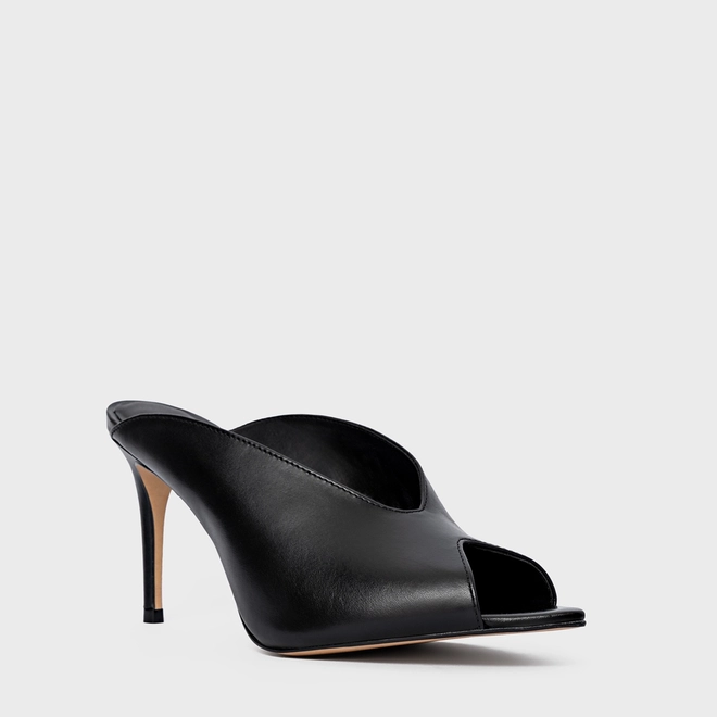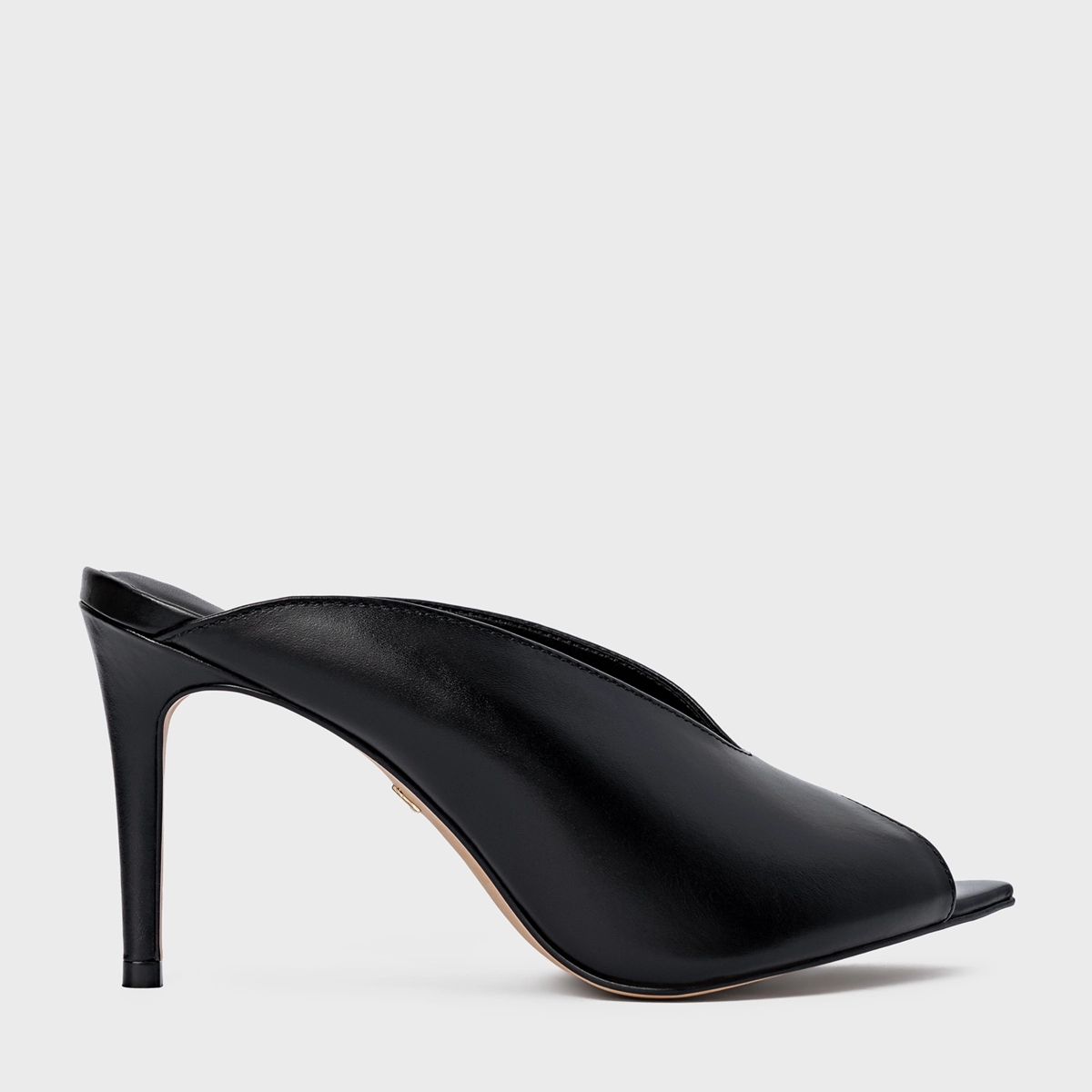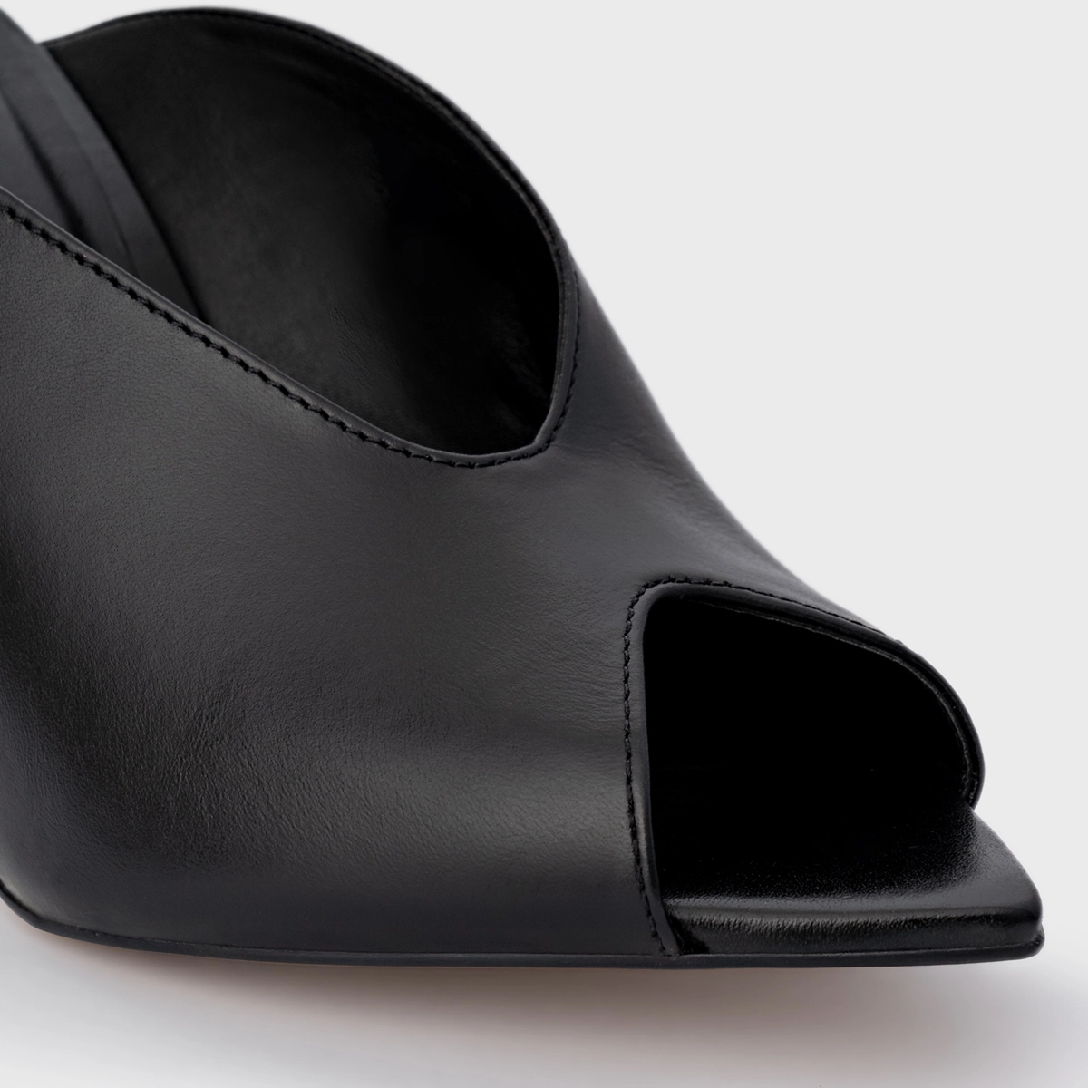 Open mule em couro, com bico folha, salto fino e decote em V. Possui dedos à mostra e parte traseira aberta.