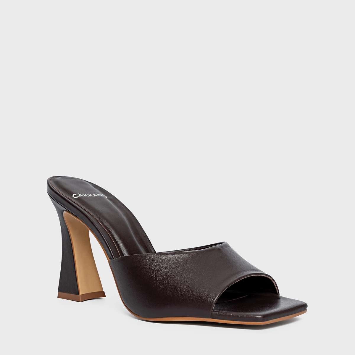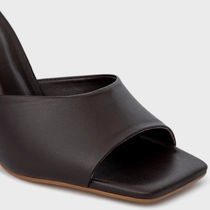 Open mule em couro. Traz uma tira larga sobre os dedos, com um salto alto levemente curvado. Conta com o bico quadrado e a parte trazeira aberta.