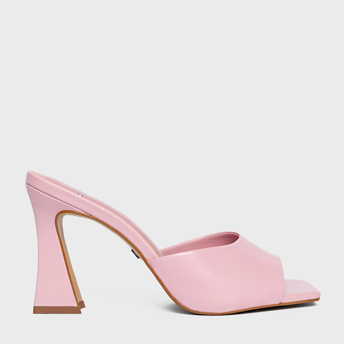 Open mule em couro. Traz uma tira larga sobre os dedos, com um salto alto levemente curvado. Conta com o bico quadrado e a parte trazeira aberta.