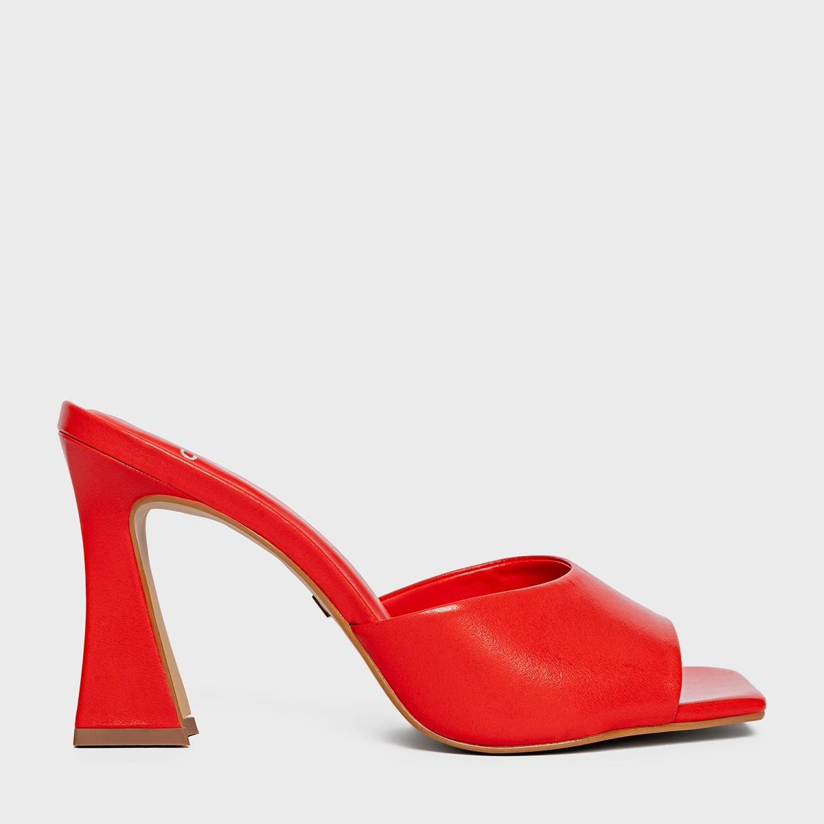 Open mule em couro. Traz uma tira larga sobre os dedos, com um salto alto levemente curvado. Conta com o bico quadrado e a parte trazeira aberta.