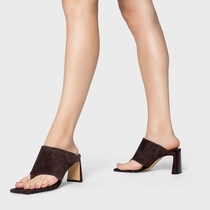 Open mule thong em couro suede, bico quadrado e salto em formato geométrico. Possui tiras largas que dividem os dedos, remetendo ao design de um chinelo.