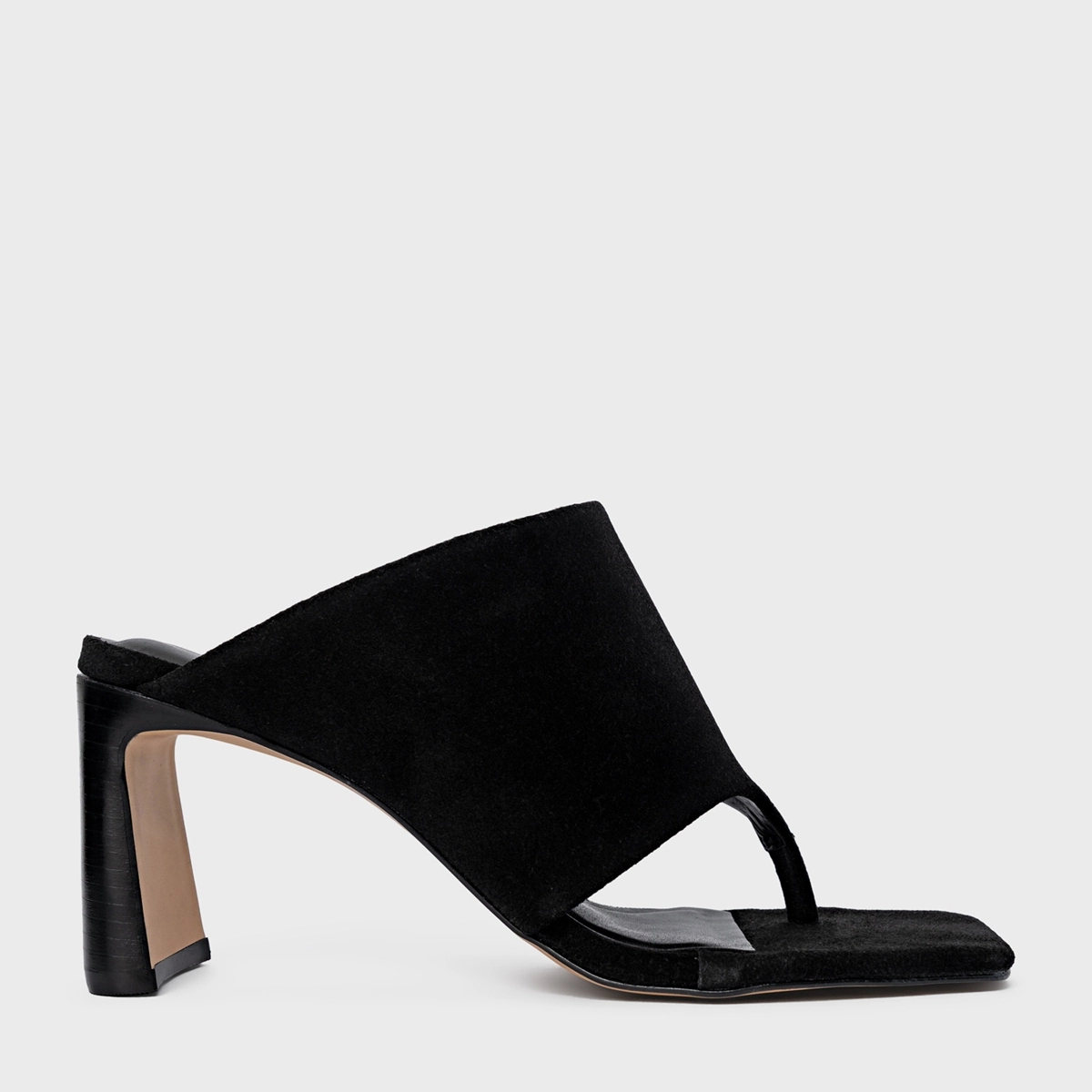 Open mule thong em couro suede, bico quadrado e salto em formato geométrico. Possui tiras largas que dividem os dedos, remetendo ao design de um chinelo.