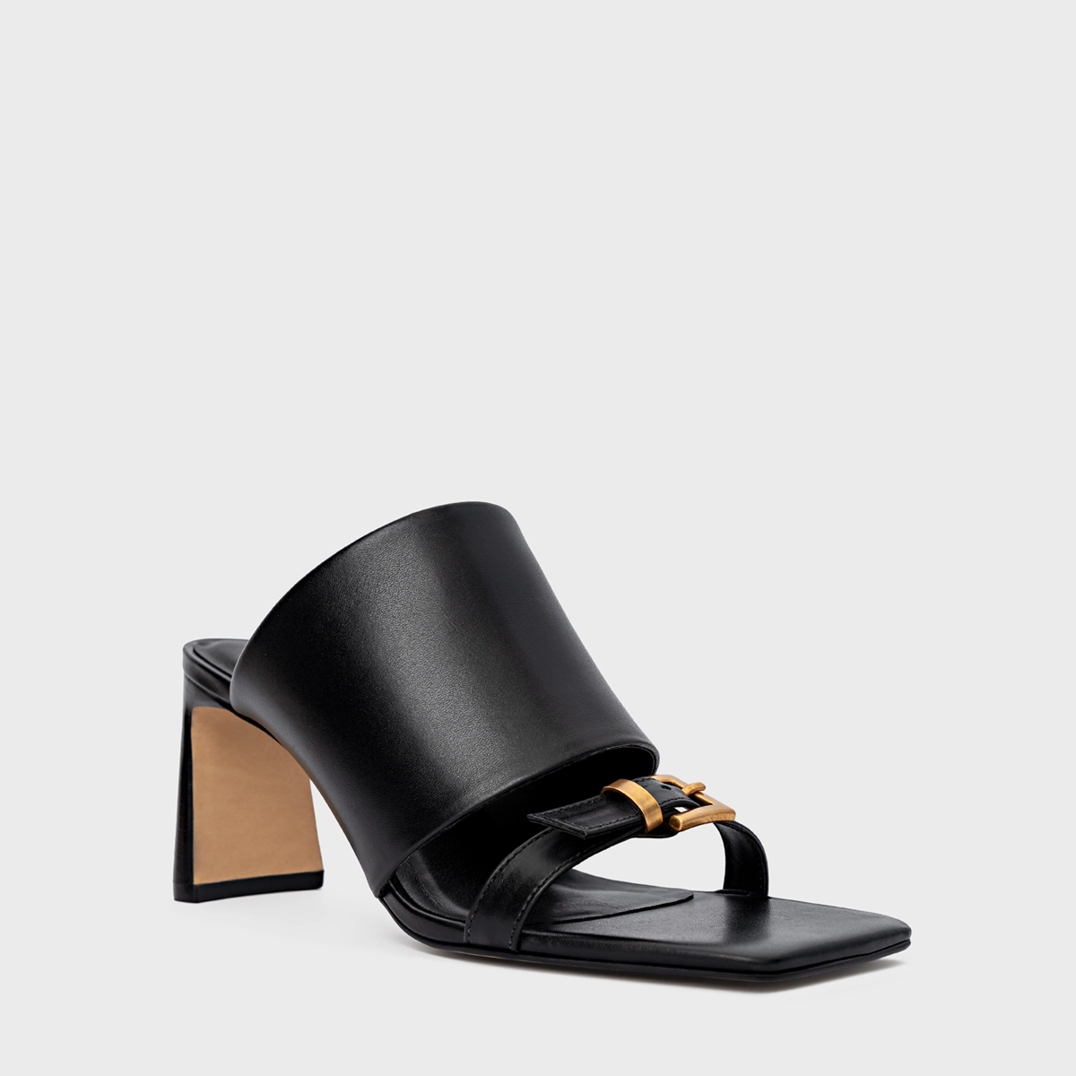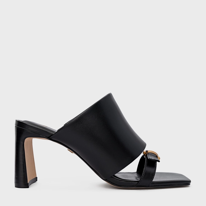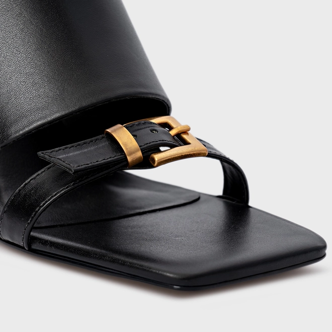 Open mule em couro, bico quadrado e salto fino. Possui tira sobre os dedos com adorno em fivela, e outra tira larga no peito do pé.
