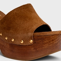 Open Mule Plataforma Wood Studs Couro Suede Marrom Saddle