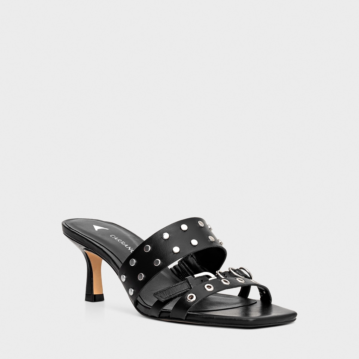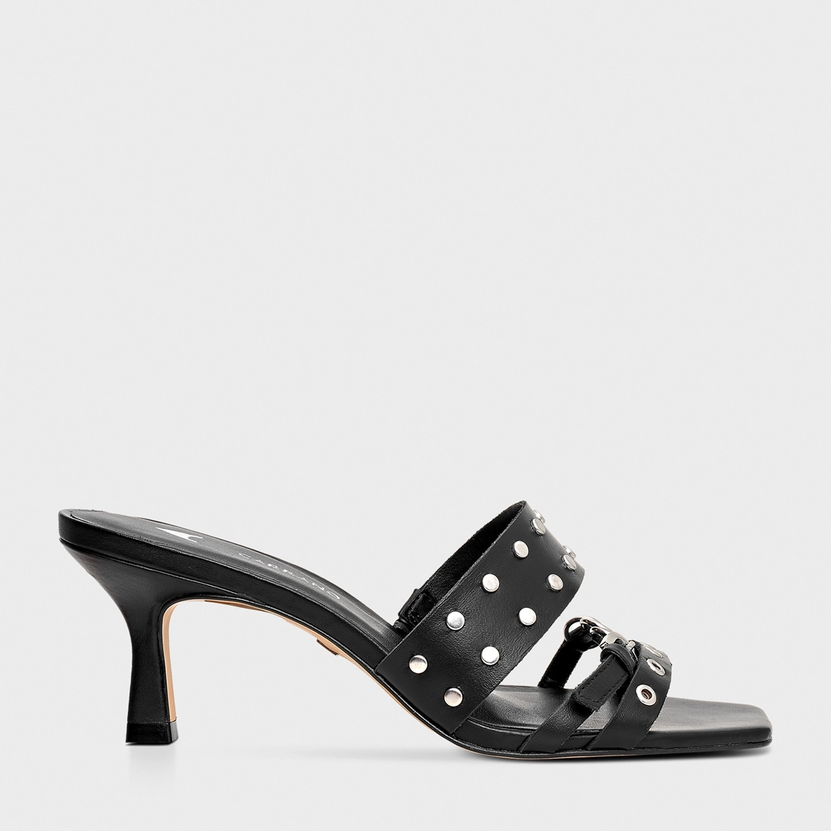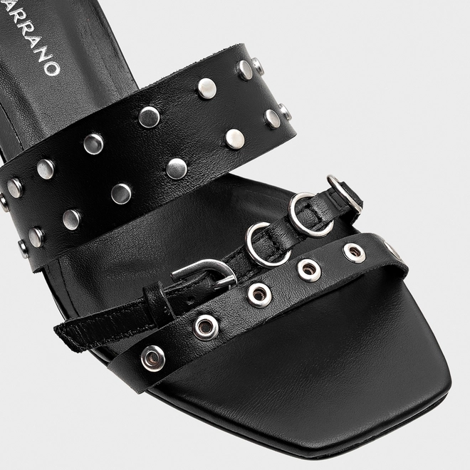 Open mule de couro com bico quadrado, apresentando três tiras: uma com ilhoses, outra com fivela e a última com tachas. Palmilha com ícone aplicado e inscrição do nome da marca.