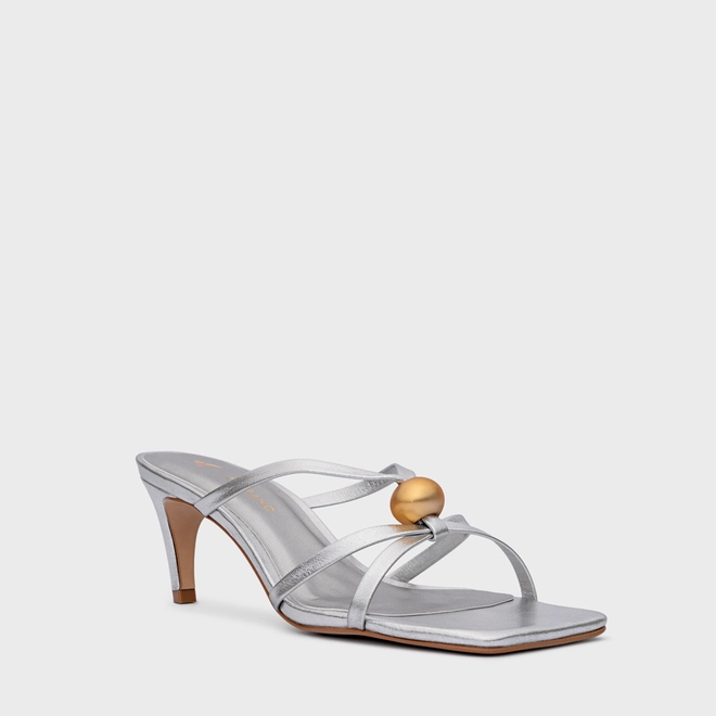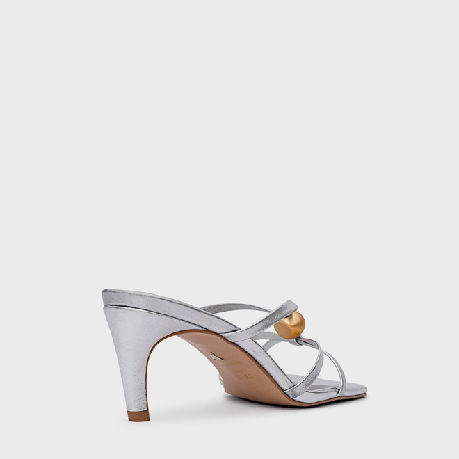 Open Mule Sphere Salto Fino Couro Metalizado Prata