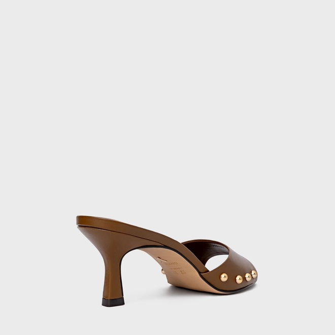 Open Mule Statement Studs Salto Fino Couro Marrom Saddle