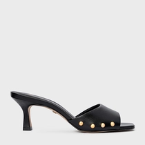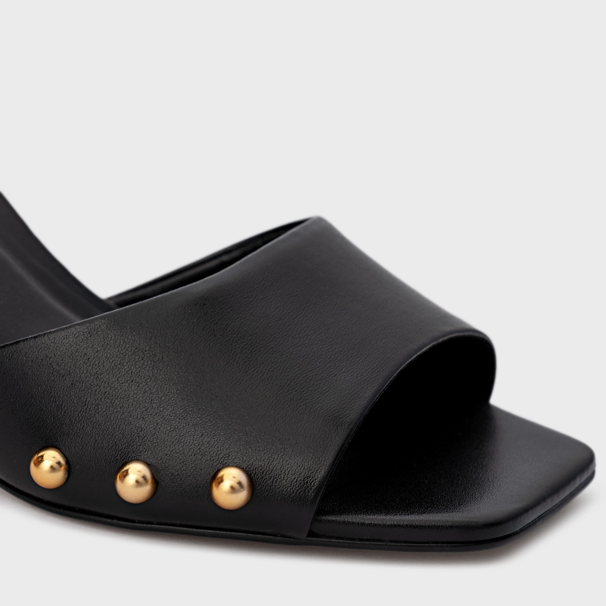 Open mule em couro, com bico quadrado e salto fino. Possui tira larga acima dos dedos com aplicação de tachas metálicas, cabedal aberto e parte traseira livre.
