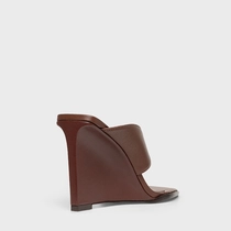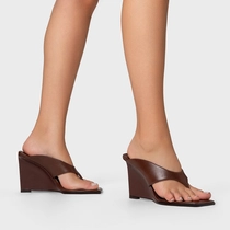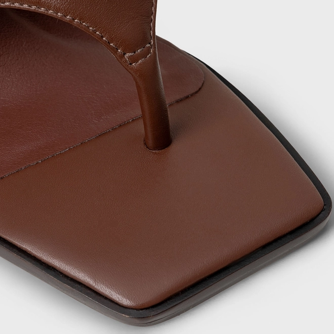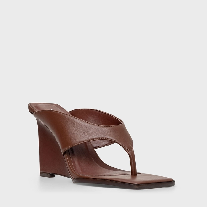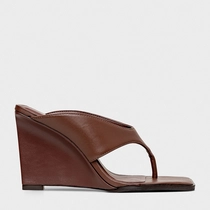Open mule thong em couro com bico quadrado e salto anabela. Modelo aberto estilo chinelo, com tiras largas que separam os dedos do pé.