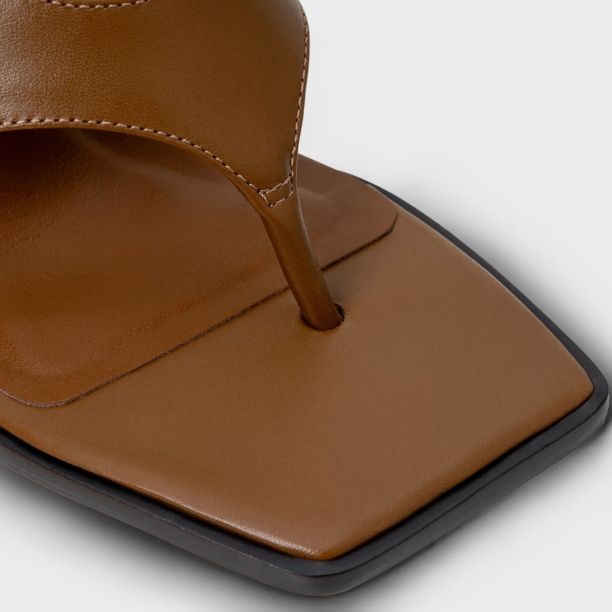Open mule thong em couro com bico quadrado e salto anabela. Modelo aberto estilo chinelo, com tiras largas que separam os dedos do pé.