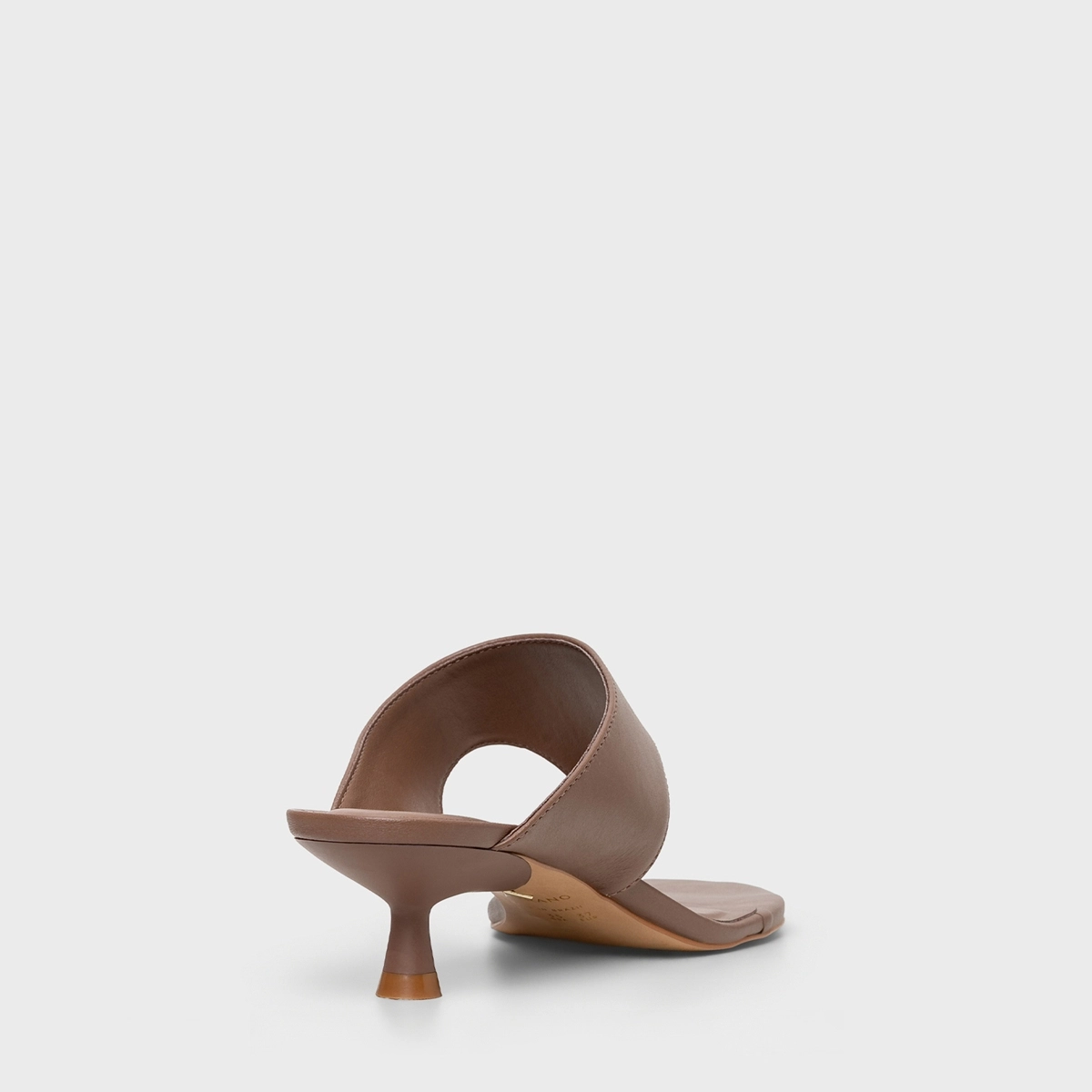 Open mule thong em couro com bico arredondado e salto estilo kitten heel. Modelo aberto estilo chinelo, com tiras largas que separam os dedos do pé.