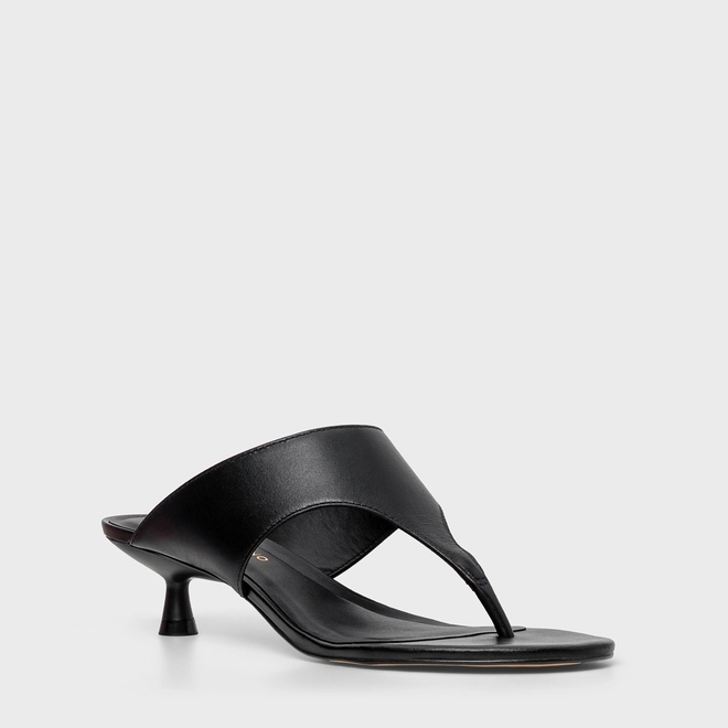 Open mule thong em couro com bico arredondado e salto estilo kitten heel. Modelo aberto estilo chinelo, com tiras largas que separam os dedos do pé.