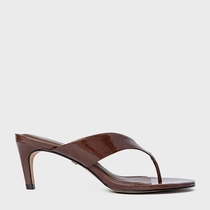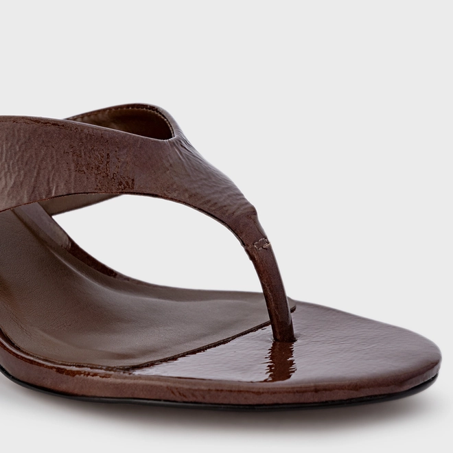 Open Mule Thong Timeless Salto Fino Couro Verniz Marrom Brownie