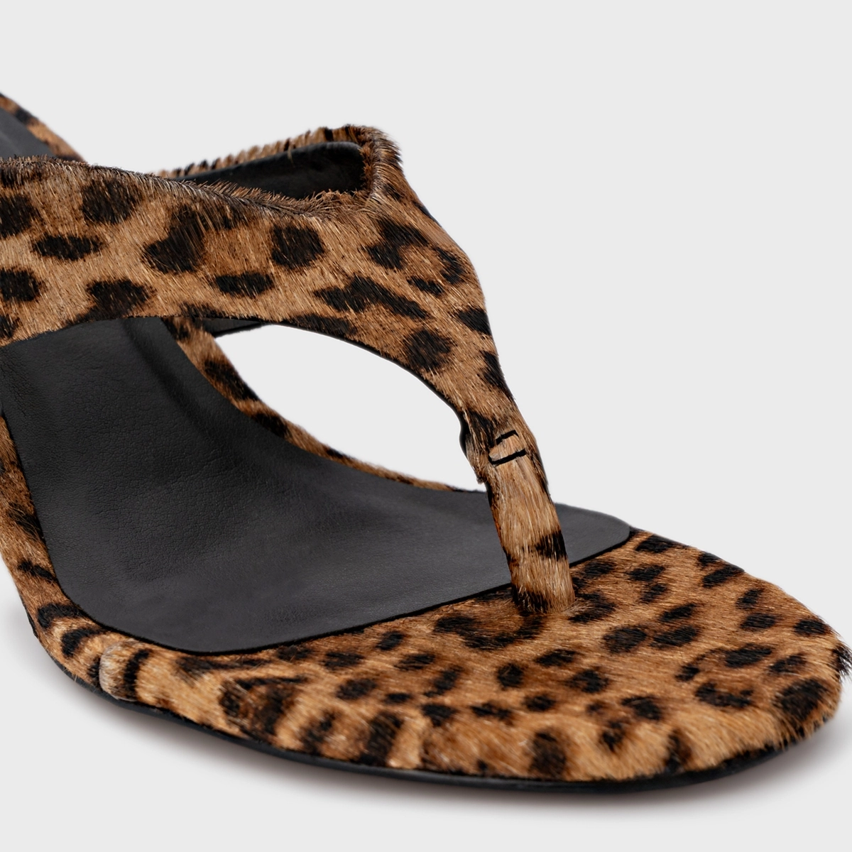 Open mule thong em pelo com estampa de animal print, com bico quadrado e salto fino. Possui tiras que dividem os dedos, remetendo ao design de um chinelo.