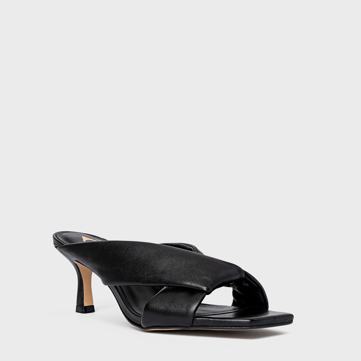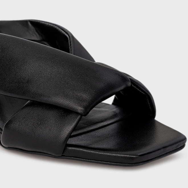Open Mule Tiras Puffy Salto Fino Couro Preto