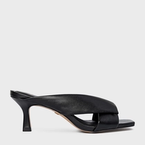 Open mule em couro, com salto fino e bico quadrado. Possui tiras acolchoadas que cruzam o cabedal.