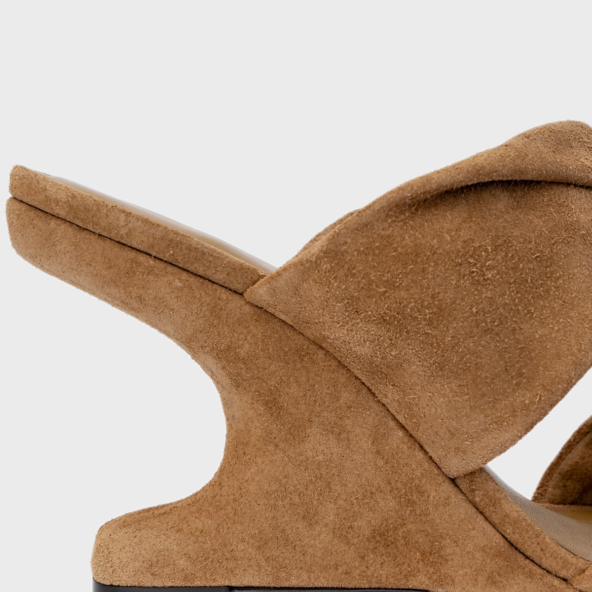 Open mule em couro suede, com bico aberto e salto anabela recuado para dentro. Possui tiras largas com efeito torcido, criando recortes orgânicos, e solado baixo na parte frontal.