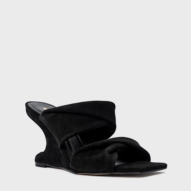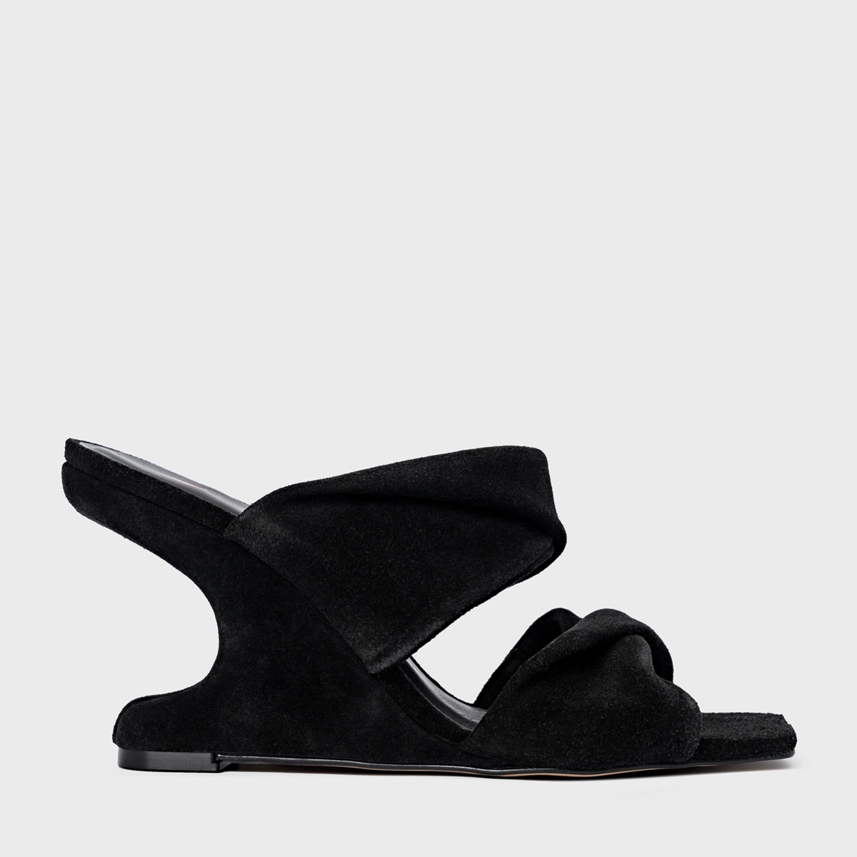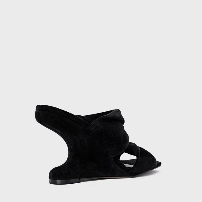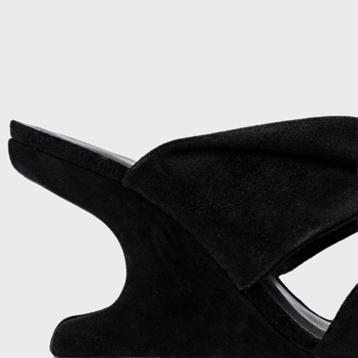 Open Mule Twist Anabela Curve Couro Suede Preto