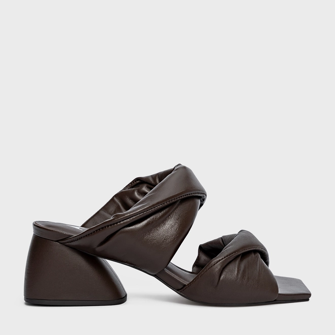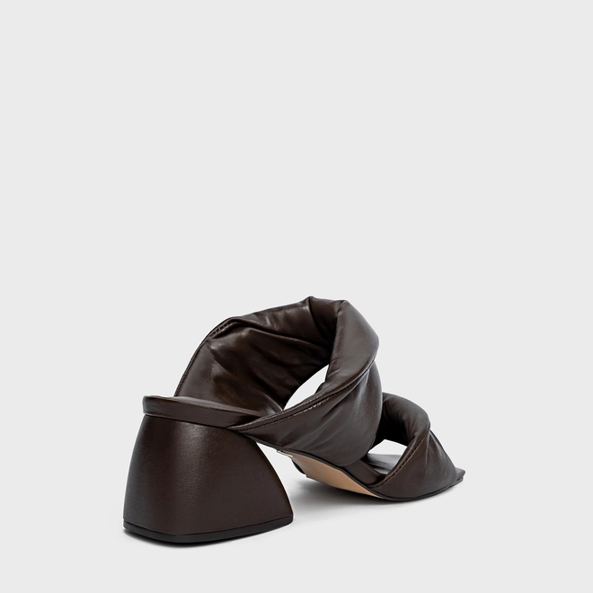 Open Mule Twist Puffy Salto Flare Couro Marrom Dark Brown