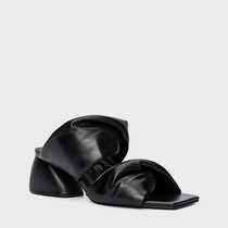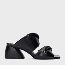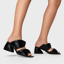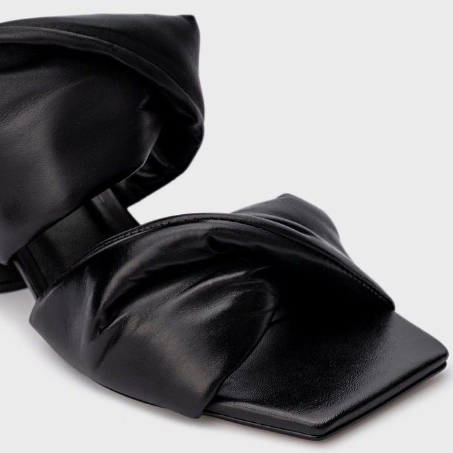 Open Mule Twist Puffy Salto Flare Couro Preto