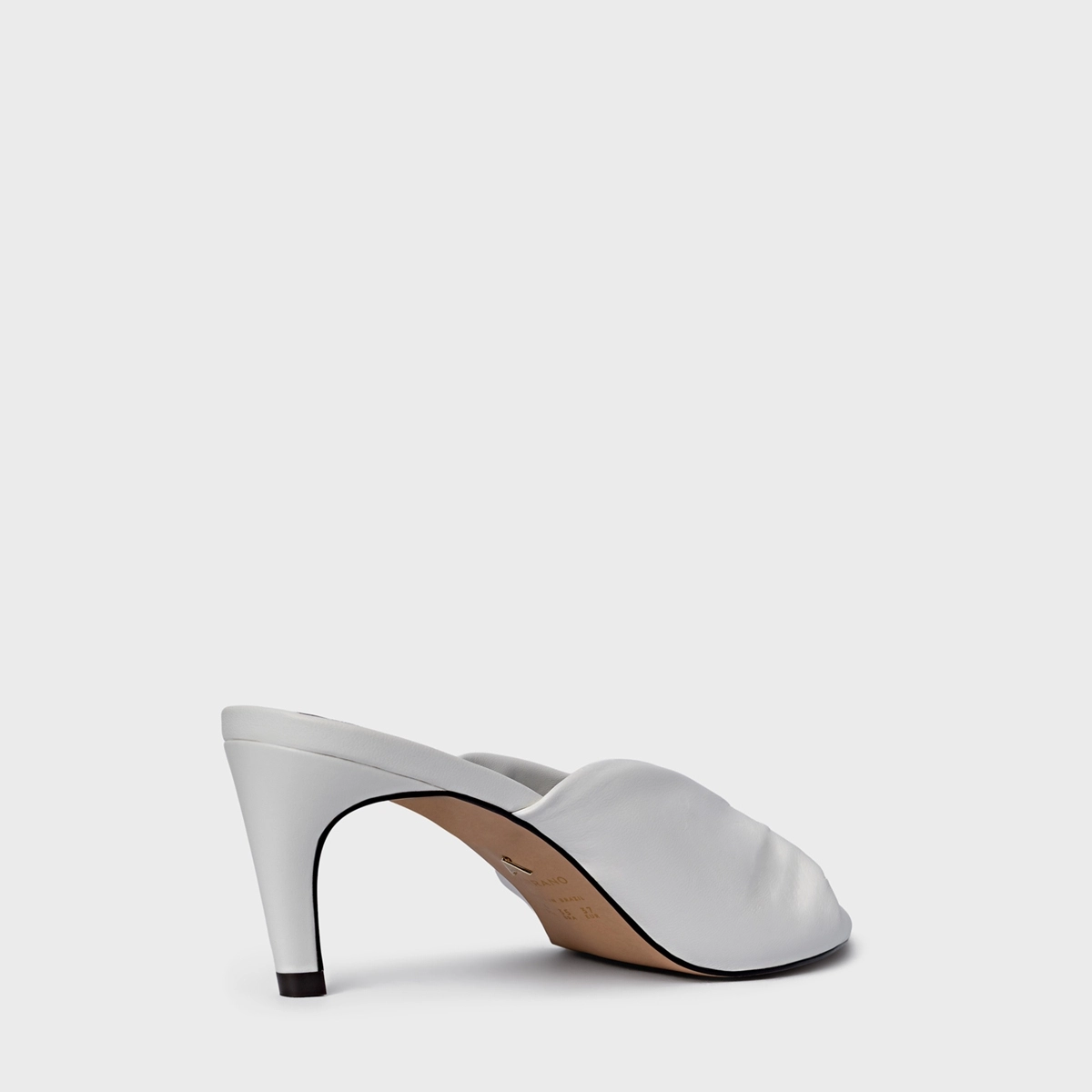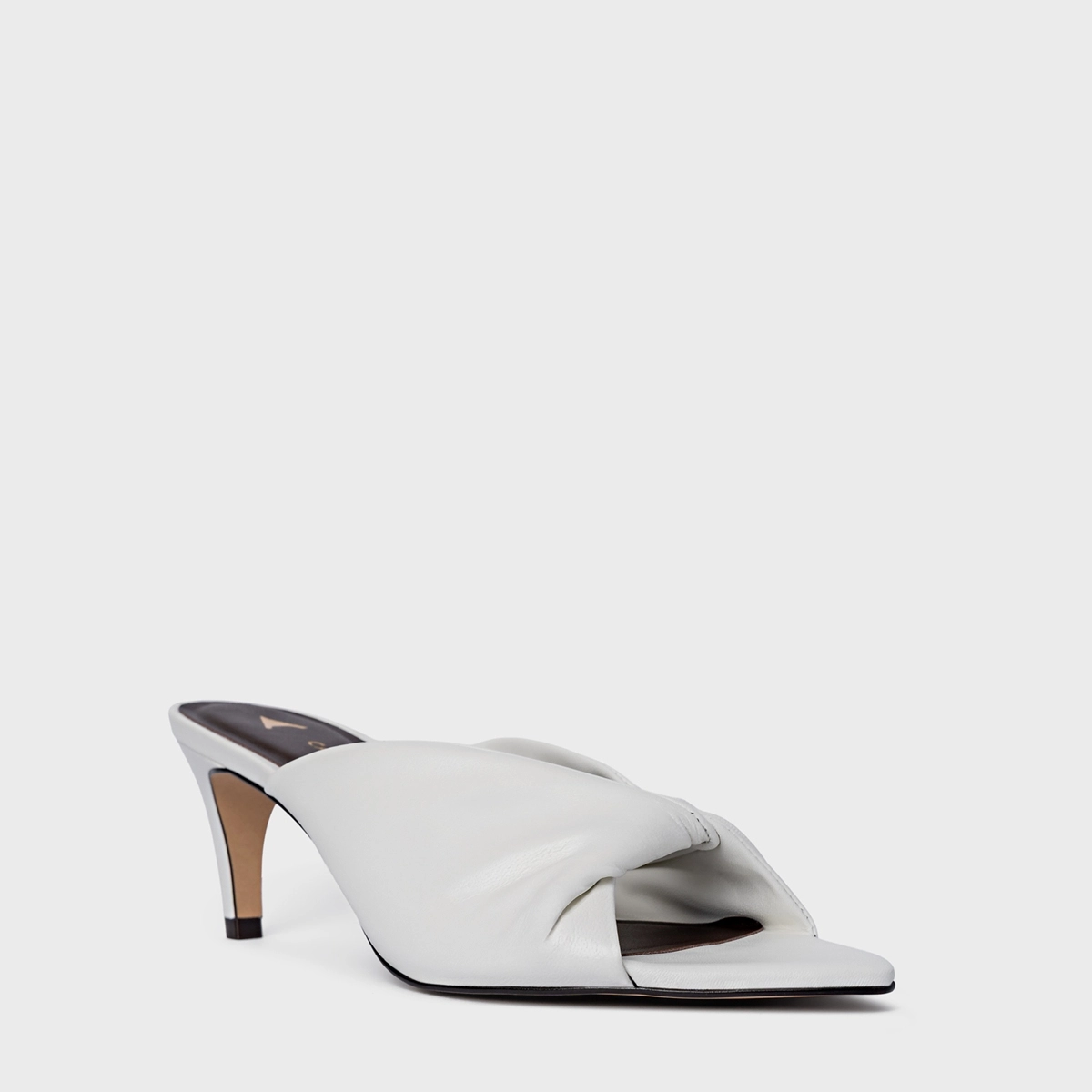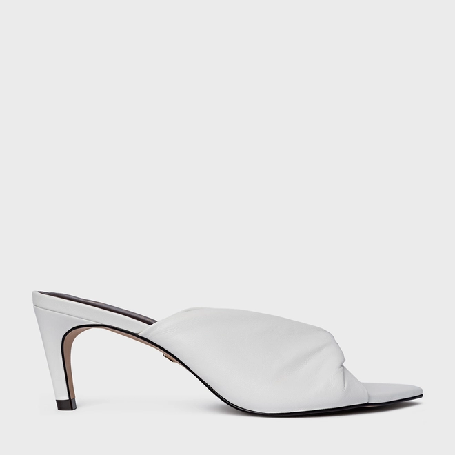 Open mule em couro, com bico fino aberto e salto estilo kitten heel. Possui tira sobre os dedos com efeito torcido.