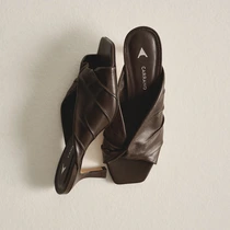 Open Mule Twist Salto Fino Couro Marrom Dark Brown