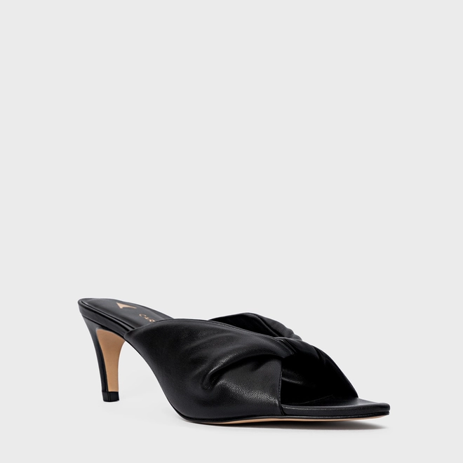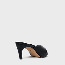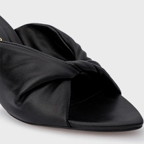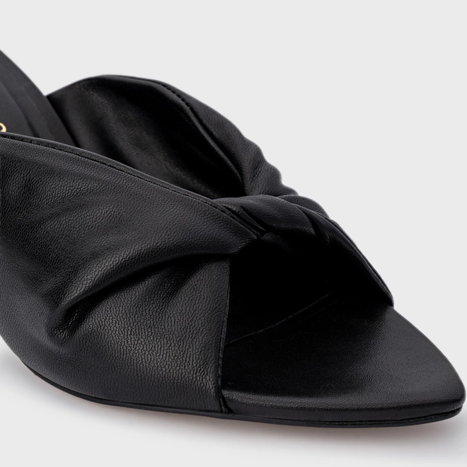 Open mule em couro, com bico fino aberto e salto estilo kitten heel. Possui tira sobre os dedos com efeito torcido.