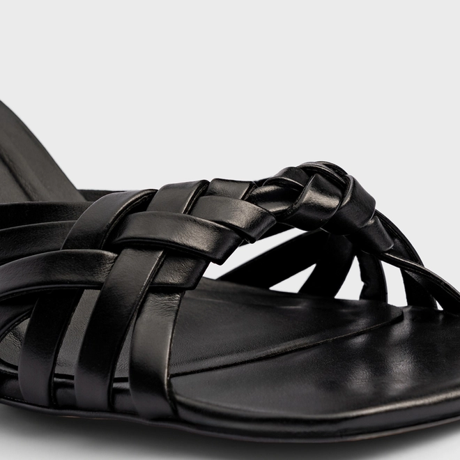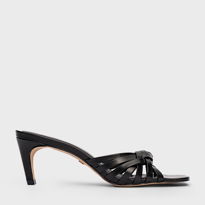 Open mule de couro com salto fino médio e bico levemente quadrado. Modelo aberto, contém tiras finas entrelaçadas sobre os dedos, trazendo um design minimalista mas marcante.